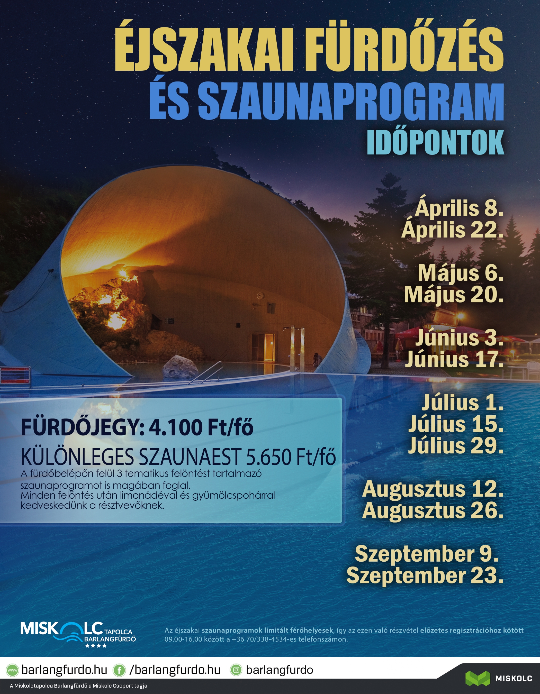 FONTOS! az éjszakai szaunaprogramok limitált férőhelyesek, így az ezen való részvétel előzetes regisztrációhoz kötött (08:00-16:00 között a +36 70/338-4534-es telefonszámon).