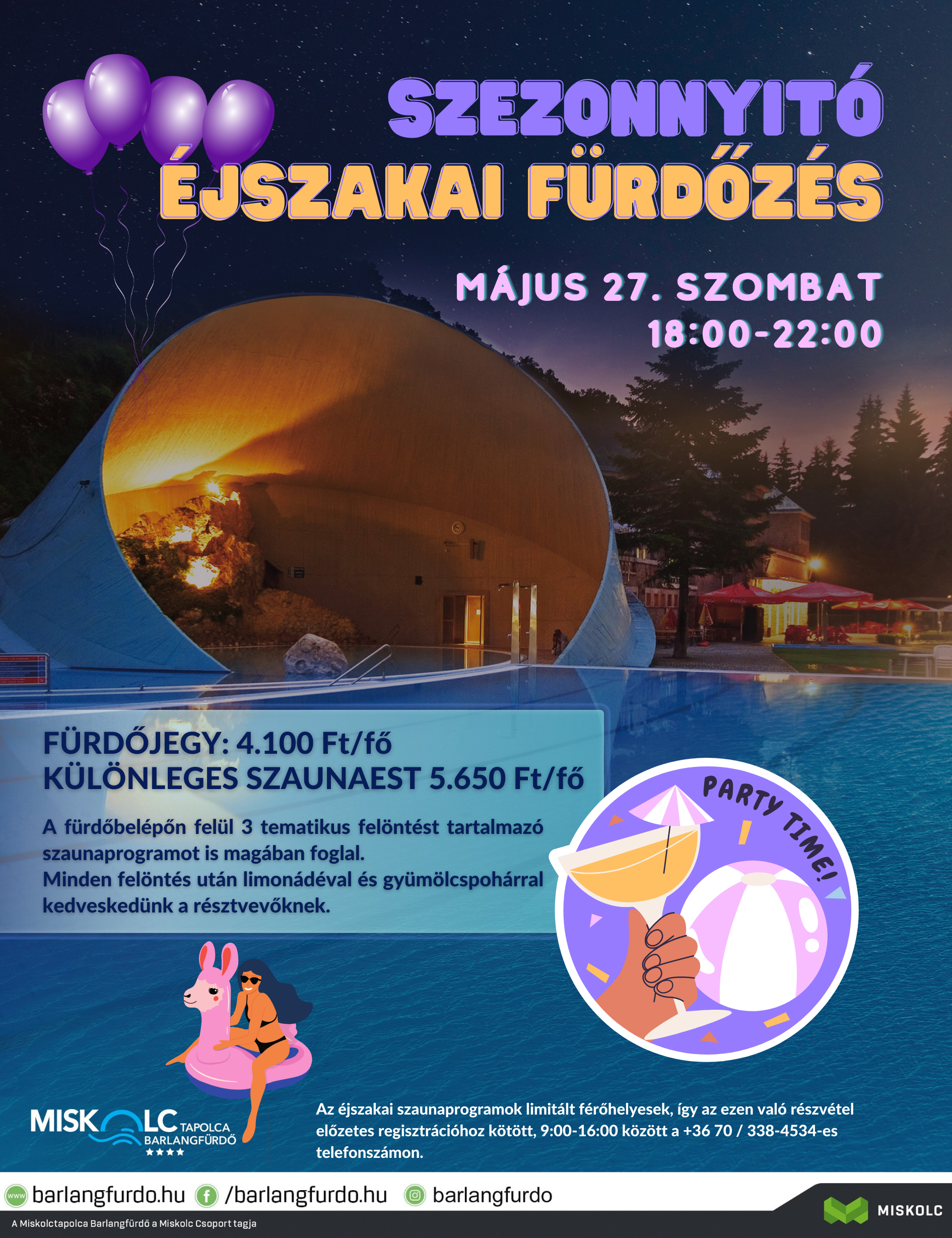Május 27-én 18:00-22:00-ig, Szezonnyitó Éjszakai Fürdőzéssel várunk benneteket a Miskolctapolca Barlangfürdőben!