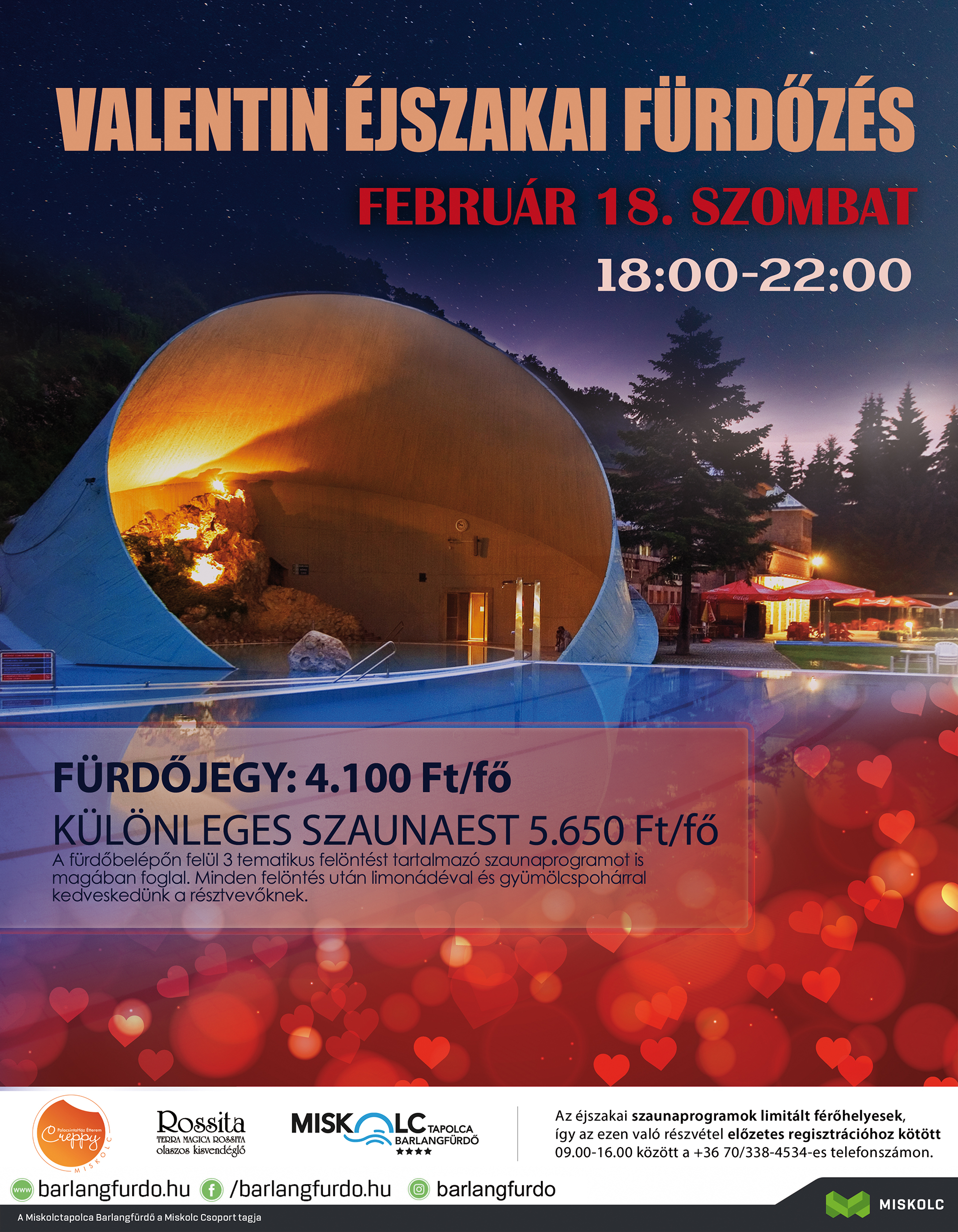 FONTOS! az éjszakai szaunaprogramok limitált férőhelyesek, így az ezen való részvétel előzetes regisztrációhoz kötött (08:00-16:00 között a +36 70/338-4534-es telefonszámon).